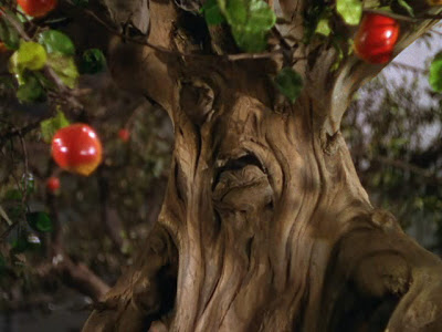 This patch of woods features a crudely hand-painted ‘No Trespassing’ sign just like the witch’s enchanted forest did.- The old woman’s garden over the wall and her green house are filled with more exotic fake-looking plants. As animated as the human apple trees on yellow brick road, they are very Oz-like indeed. See E.T.